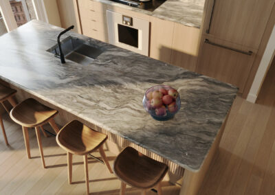 Oversized, triple-glazed windows bathe the home in soft light, while European Oak wood flooring runs throughout. The custom-designed kitchen features milk oak soft-close cabinetry and honed Fusion Blue Quartzite countertops. A fully integrated Gaggenau appliance suite makes every meal a pleasure to prepare and enjoy.